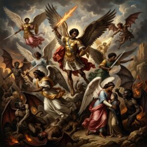 Angels are generally described in religious, particularly biblical, contexts as created, immortal, and intelligent spirit beings who act as God’s messengers, servants, and agents of protection. They are numerous, powerful, and invisible, though capable of taking human form, often serving to fulfill divine will and intervene in human lives.